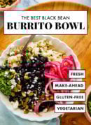 This homemade black bean burrito bowl recipe features cilantro-lime rice, tender black beans, pickled onions and fresh cilantro pesto! This healthy bowl makes great leftovers, too. Itโs vegetarian (easily vegan) and gluten free. Recipe yields 4 hearty burrito bowls.