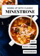 Warm up with this vegetarian minestrone soup! This classic minestrone soup recipe is healthy, easy to make, and tastes incredible. Itโs vegan, too, if you donโt top it with cheese. Recipe yields 6 bowls or 8 cups of soup.