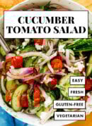 When it’s blazing hot outside, this cucumber tomato salad is exactly what I want to eat. This recipe is crisp and refreshing, light yet satisfying. It’s the perfect side dish to make with a surplus of cucumbers and tomatoes from your garden or farmers’ market.