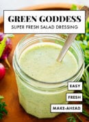 This homemade green goddess dressing recipe is so easy to make! Itโs creamy, fresh, completely deliciousโand a great way to use up your leafy herbs. Recipe yields about 1 ยผ cups dressing; multiply if desired.
