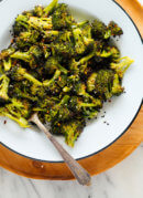 Change it up: Your garnishes can offer extra flavor. I love finishing the broccoli with a light drizzle of thick balsamic vinegar or balsamic reduction, or a squeeze of fresh lemon juice (bonus points for adding lemon zest, too). Grated Parmesan is a good idea, especially if you’re serving your broccoli with Italian main dishes. You can’t go wrong with a light sprinkle of red pepper flakes. For an Asian spin, top with sesame seeds (white or black), and a light drizzle of toasted sesame oil.