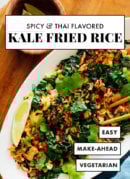 Vegetarian weeknight fried rice with sautรฉed kale, coconut flakes and rice. The dish is finished with Thai flavors like lime, cilantro and sriracha.