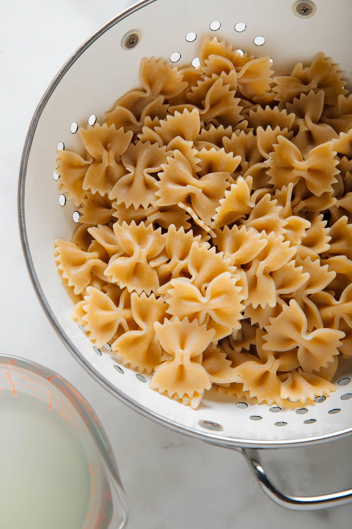 - Bring a large pot of salted water to a boil. Place a colander in the sink with a glass liquid measuring cup or heat-safe bowl next to it. Add the pasta to the boiling water and cook until al dente, as directed on the package instructions. Remove the pot from heat and ladle/pour about 1 cup of the pasta water in the glass measuring cup. Drain the pasta in the colander and let it rest, covered loosely with a pot lid or plate.