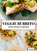 These amazing vegetarian breakfast burritos are stuffed with scrambled eggs and beans, easy homemade hash browns and fresh herbs. Enjoy them now and freeze the extra burritos for quick meals later. Recipe yields 6 breakfast burritos.